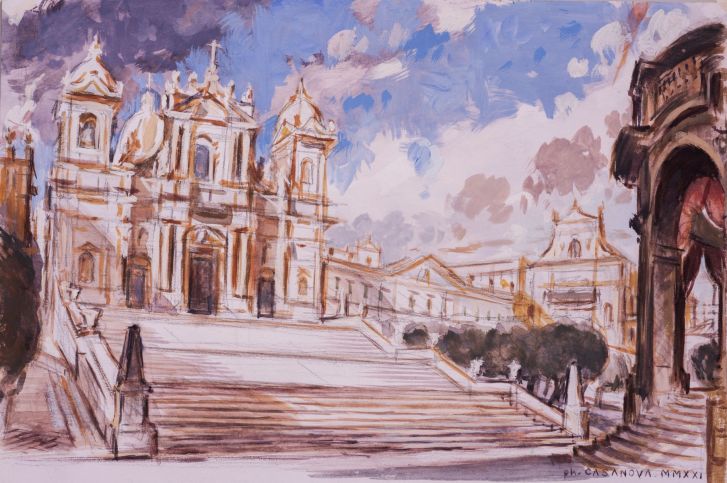First scene sketch for a concert on the Spanish Steps (Rome); 25x27 cm; watercolor and gouache on paper; 2022; artist's collection